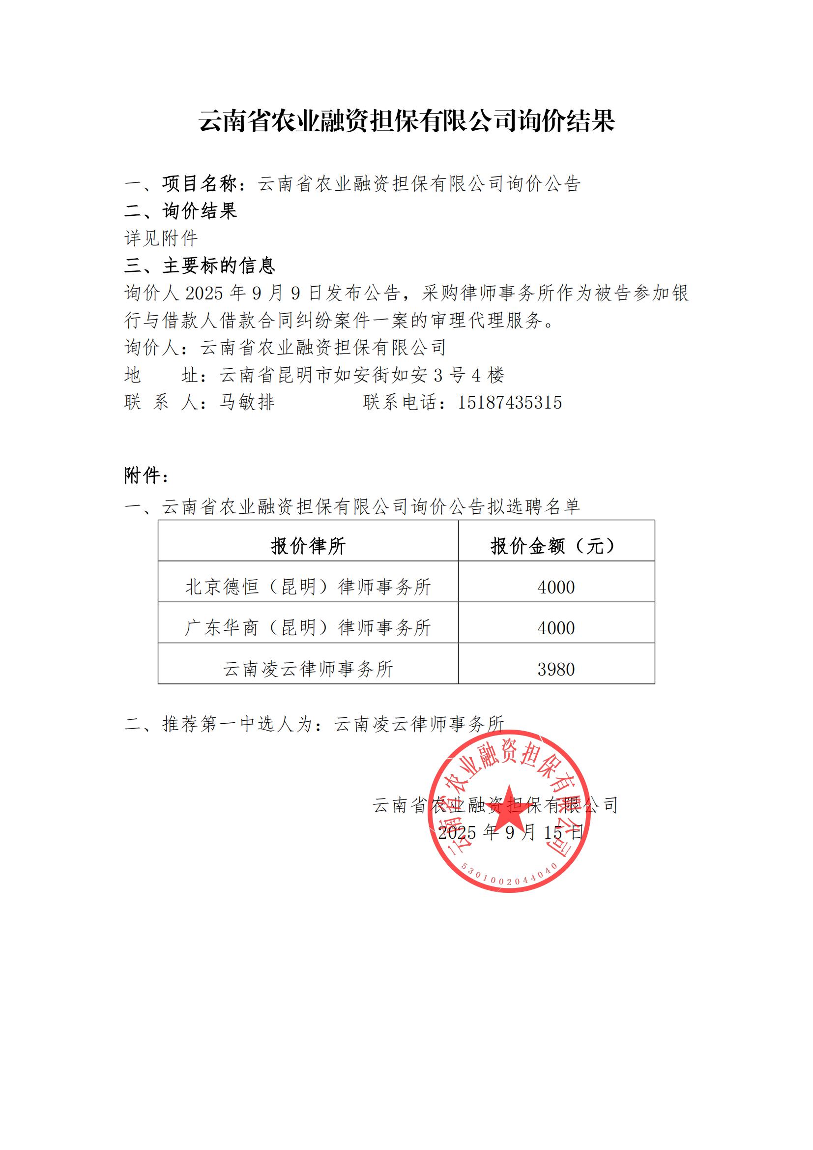 云南省農(nóng)業(yè)融資擔保有限公司詢價結(jié)果