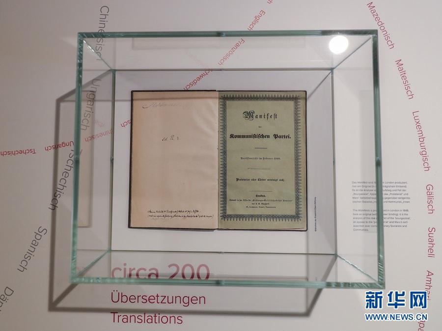 歷史長河奔流不息,真理之光穿越時空。1818年5月5日,德國小城特里爾,一代偉人馬克思誕生。200年后,世界東方。高擎馬克思主義的精神火炬,在習(xí)近平新時代中國特色社會主義思想指引下,中國共產(chǎn)黨正領(lǐng)導(dǎo)億萬人民書寫人類發(fā)展史上新的奇跡。這是2018年5月3日在德國特里爾馬克思故居紀念館內(nèi)拍攝的1848年出版的《共產(chǎn)黨宣言》第一版。