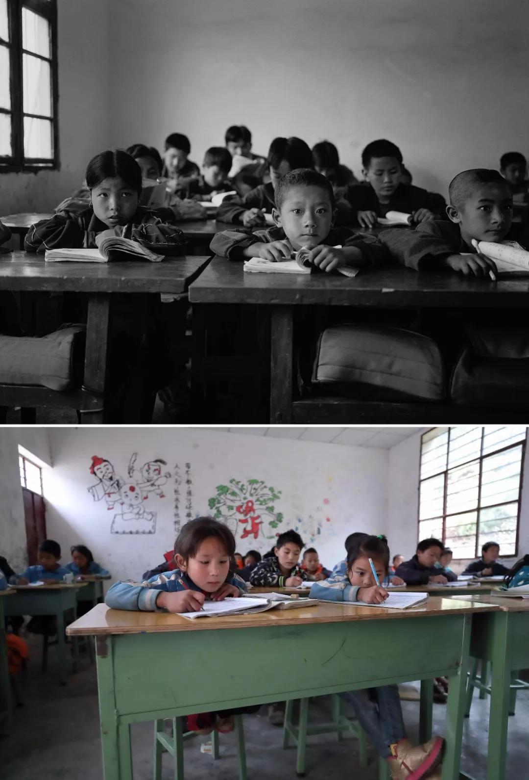 拼版照片:上圖是2007年10月24日,四川涼山彝族自治州布拖縣烏依鄉(xiāng)阿布洛哈村小學一年級學生在上課(林強攝);下圖是2017年1月6日,阿布洛哈村小學二年級學生在上課(新華社記者江宏景攝)。20世紀60年代,當地將300多名麻風病人集中在阿布洛哈隔離治療,從此這里被叫做“麻風村”。在社會各界的幫助下,這里發(fā)生了很大變化。新華社發(fā)