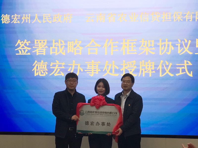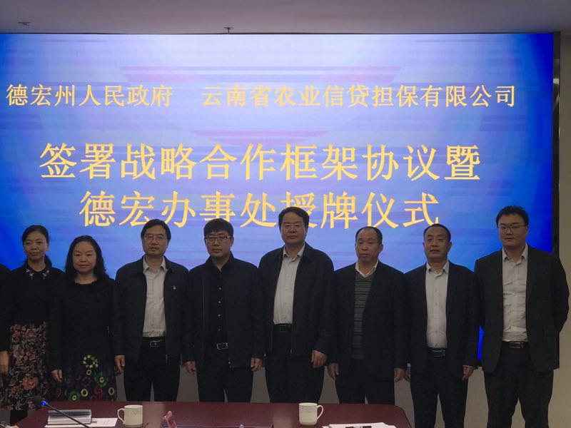 12月19日上午,德宏州人民政府、云南農(nóng)擔(dān)公司簽署戰(zhàn)略合作框架協(xié)議暨德宏辦事處授牌儀式在芒市會(huì)堂舉行。德宏州委常委、常務(wù)副州長馬云峰,農(nóng)擔(dān)公司董事長郭影、總經(jīng)理杜開波、機(jī)構(gòu)部負(fù)責(zé)人蔡菲、德宏州財(cái)政局、農(nóng)業(yè)局、人行德宏支行、德宏銀監(jiān)分局、農(nóng)行德宏分行、省聯(lián)社德宏辦、各縣市政府等相關(guān)單位參加會(huì)議。