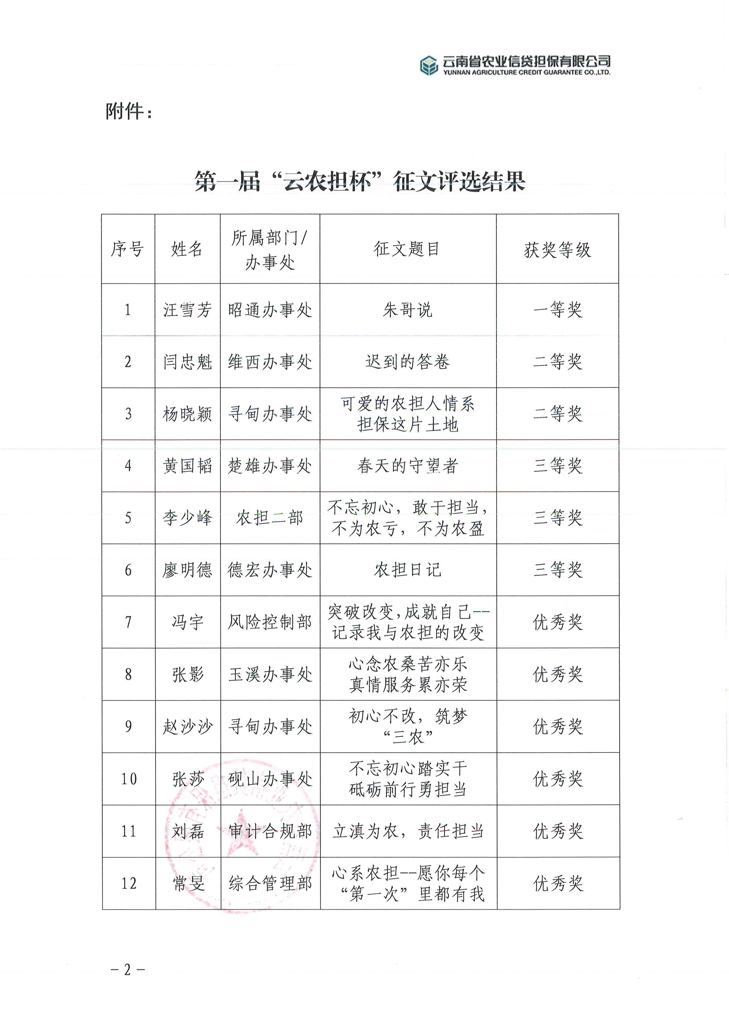 云南省農(nóng)業(yè)信貸擔(dān)保公司第一屆“云農(nóng)擔(dān)杯”征文活動結(jié)果公示各部門、辦事處: