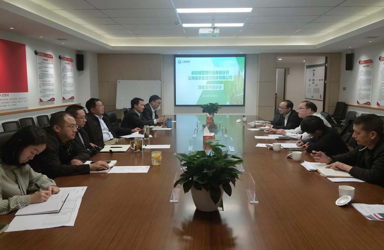 2019年4月3日下午,郵儲銀行云南省分行孟浩副行長率三農(nóng)金融部、授信管理部、小企業(yè)金融中心、公司業(yè)務部到云南農(nóng)擔公司座談,公司杜開波總經(jīng)理、廖寅皓副總經(jīng)理及業(yè)務、風控,機構(gòu)等部門參加座談。會上雙方就業(yè)務辦理效率及保后監(jiān)管等方面內(nèi)容交換意見,并對下一步工作方向達成一致。
