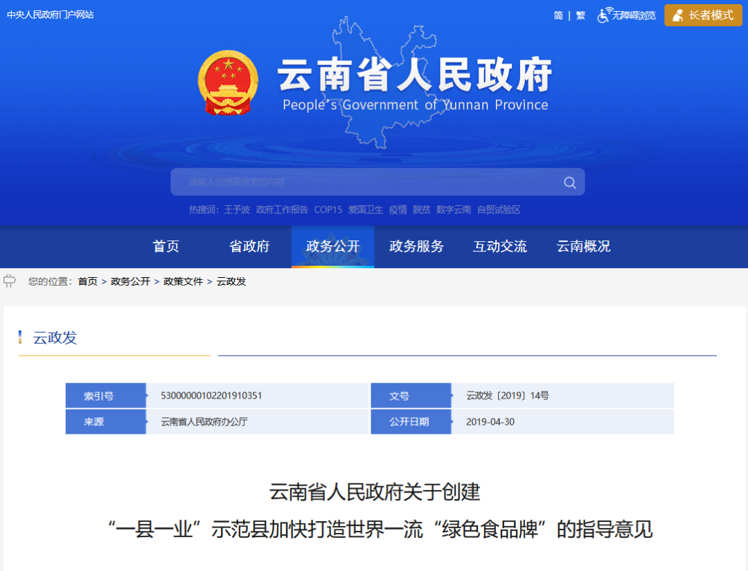 2019年云南省人民政府出臺了《云南省人民政府關(guān)于創(chuàng)建“一縣一業(yè)”示范縣 加快打造世界一流“綠色食品牌”的指導(dǎo)意見》(以下簡稱《指導(dǎo)意見》)