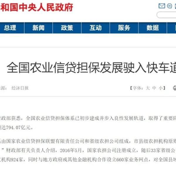 全國(guó)農(nóng)業(yè)信貸擔(dān)保體系已初步建成并步入良性發(fā)展軌道,取得了重要階段性成效。目前,全國(guó)農(nóng)擔(dān)體系資本金總額達(dá)794.07億元。